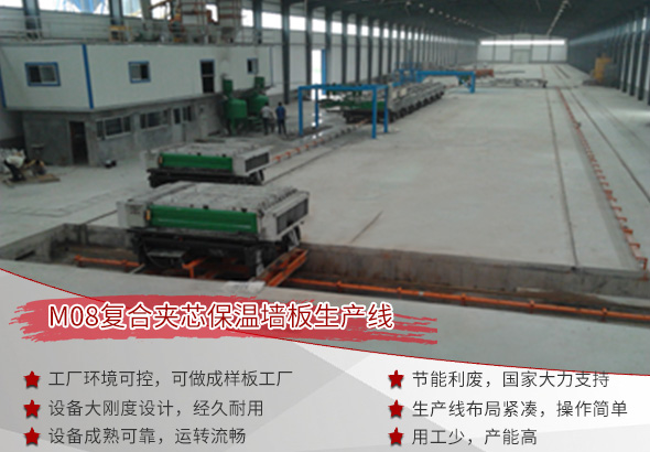 M08復合夾芯保溫墻板生產線也是鄭州瑪納M成組立模系列生產線,屬機械自動化模腔成型,成型精密度精準度高,制作工藝穩定性比較好,可依據各地資源利用不同原材料,生產制造出多種結構,多種功能,多種使用用途的新型復合夾芯保溫隔墻板。整條生產線是流水作業連續式生產,具有“規模大、產能高、自動化程度高”等諸多特點,布局緊湊、工藝簡單、生產效率較高,周期縮短,生產現場環境可控,且熱交換環節少,熱損耗小,節能效果十分明顯。