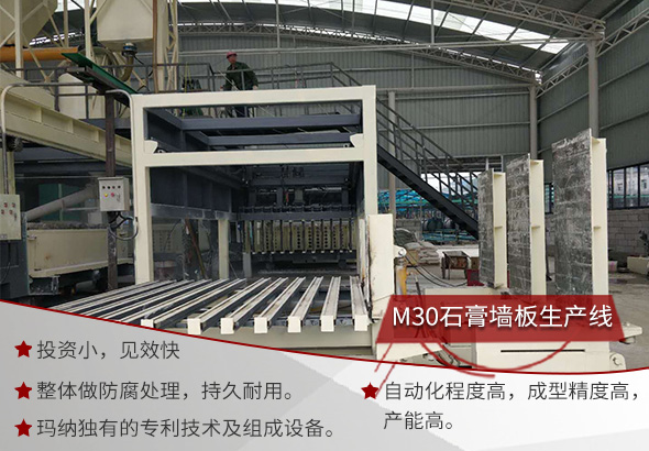 M30石膏墻板生產(chǎn)線主要設(shè)備:三代不漏漿成組立模、三代液壓自動(dòng)抽芯機(jī)、成型芯管、推板機(jī)、合板翻板機(jī)、上壓成型、擺渡車。