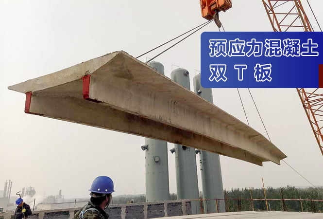雙T板全稱預應力混凝土雙T板,是一種先張法預應力混凝土梁板一體化構件,由寬大的面板和2根窄而高的肋組成的單向受力板,如下圖所示。雙T板肋寬度常為100mm,面板厚度一般為50mm,面板寬度常為2m、2.4m、3m,雙T板截面高度常為350~700mm(最高可達960mm),跨度常為9~18m、最大可達30m以上。其翼緣厚度分等厚度和變厚度2種,按沿跨度方向的整體截面形式不同又可分為等截面雙T平板和雙坡變截面雙T板。