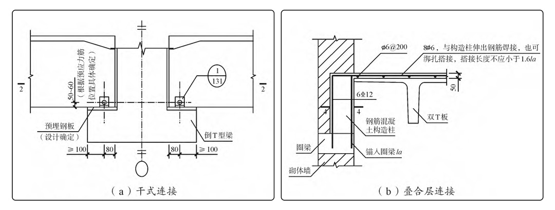 目前,有國家圖集18G432-1《預應力混凝土雙T板》作為工程應用依據。其連接構造分為干式連接、疊合層連接和組合連接3種,其中干式連接和疊合層連接如上圖所示。干式連接包括焊接和螺栓連接,一般用于低抗震設防烈度區;疊合層連接由疊合層抵抗樓蓋水平荷載,連接件只是方便安裝;組合連接中后澆層和連接件共同提高樓板作用;在中、高設防烈度區建議采用疊合層連接或組合連接。
