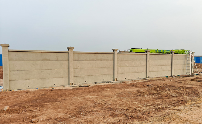 裝配式圍墻一般由柱、墻板、壓頂和柱帽構件組成,所有構件采用工廠預制。基礎施工完成后,上部預制構件按立柱-插板-壓頂-柱帽現場裝配,裝配過程由中、小型吊裝設備完成,施工方便。